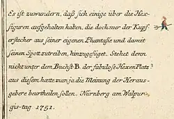 Es ist zu wundern, daß sich einige über die Hex- Figuren aufgehalten haben, die doch nur der Kupf- erstecher aus seiner eigenen Phantasie und damit seinen Spott zu treiben, hinzugefüget. Stehet denn nicht unter dem Buchst.B der fabulose Hexen-Platz? aus diesem haette man ja die Meinung der Heraus- gebere beurtheilen sollen. Nürnberg am Walpur- gis-tag. 1751.