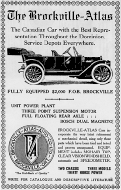 Das Unternehmen wurde 1911 gegründet, ebenfalls in Brockville. Die Entwicklung eines eigenen Modells begann, dass 1912 als Brockville-Atlas auf den Markt kam. Ende 1914 lief die Produktion aus, auch als Folge des Ersten Weltkriegs.[3] Insgesamt entstanden etwa 300 Fahrzeuge.[2][3]