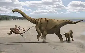 Brontomerus wehrt mit dem Hinterbein einen räuberischen Utahraptor ab (Lebendrekonstruktion). | ||||||||||||