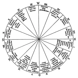 Nach römischer Auffassung waren dagegen die ersten drei Himmelsregionen von Nord nach Nordost allein den Blitzen des Jupiter vorbehalten.[26] Jupiter konnte zudem seine Blitze aus allen Himmelsregionen werfen.[27] Martianus Capella, ein römischer Enzyklopädist des 5. oder frühen 6. Jahrhunderts, hat in seinem Werk De nuptiis Philologiae et Mercurii den 16 Himmelsregionen römische Götternamen zugeordnet. Jupiter findet sich in allen Himmelsregionen.[28]