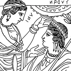 Die ersten fünf Inschriften bezeichnen die fünf Personen in der mittleren Bildszene. Der Name Turan steht zwar im oberen Streifen, bezieht sich aber zweifelsfrei auf die sitzende Person im Bildfeld darunter. Die Inschrift Vilae im unteren Streifen nimmt Bezug auf die kniende Figur im unteren Bildsegment.