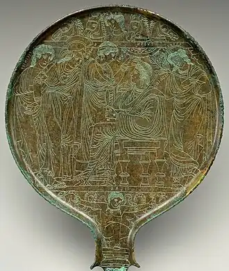 Bronzespiegel dieser Art wurden zwischen dem 6. und 3. Jahrhundert v. Chr. angefertigt, mit einer Hauptproduktionszeit im 4. Jahrhundert v. Chr. Diese Spiegel, die sehr kostbar waren und frisch poliert wie Gold leuchteten, gehörten zusammen mit dem Schmuck zum persönlichen Besitz von Frauen. Häufig dienten diese Spiegel als Brautgeschenk anlässlich der Vermählung. Daher zeigen zahlreiche Spiegel mythologische Szenen, die sich auf Liebe und Schönheit beziehen und den Brautschmuck als Vorbereitung auf die Ehe zeigen. Nach dem Tod wurden die Spiegel den Verstorbenen mit in das Grab gegeben.