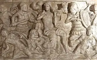 In der Mitte des Bildfelds sitzt demnach die Gottheit Cacu mit einer Leier. Vor ihm sitzt der jugendliche Artile und hält eine aufgeklappte Schreibtafel (Diptychon) in Händen. Der Text der Schreibtafel ist unleserlich. Über den beiden Figuren im Hintergrund sieht man den Kopf und die Hände eines Satyren, der sich anscheinend hinter einem Fels verbirgt und die Szene beobachtet.