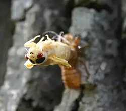 Die 4 cm langen (1,5 in) schwarzen Insekten können weder stechen noch beißen. Sobald sie die Erdoberfläche erreichen, häuten sie sich und hinterlassen die leeren Larvenhäute am Boden. Sie klettern auf Bäume und Büsche, paaren sich und sterben nach ca. zwei Wochen. Es können bis zu einer Million Exemplare pro Hektar (2,5 acres) auftreten.