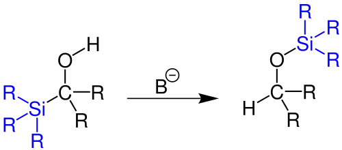 Die blau eingezeichnete Silyl-Gruppe lagert sich vom C-Atom zum Sauerstoffatom um. Die Reste an der Sylilgruppe stehen für Alkylgruppen und sind identisch. Die Reste am C-Atom können für Alkylgruppen oder Wasserstoff stehen und können verschieden sein. Als Basen kommen primäre und sekundäre Amine, Natronlauge oder Natriumhydrid zum Einsatz.