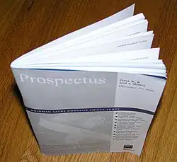 Eine Broschüre (im 18. Jahrhundert aus gleichbedeutend französisch brochure entlehnt) ist ein Schriftwerk von geringem Umfang ohne Einband, das buchbinderisch als Broschur hergestellt wird. Broschüren sind meist von nur aktuellem Interesse wie z. B. religiöse oder politische Kampfschriften, heute auch Gebrauchsanweisungen oder werbliche Produktinformationen. Die UNESCO-Statistik erfasst als Broschüren unabhängig von ihrer Verarbeitung Druckwerke von mehr als 4 bis max. 48 Seiten (drei Oktav-Bögen).[1] Kleinere solche Schriftwerke (1–2 Seiten) werden als Flyer bezeichnet.