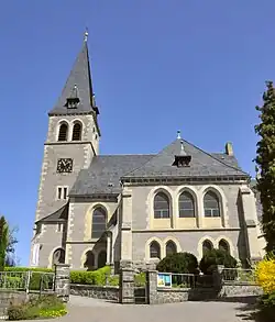 Im Jahre 1895 wütete ein Brand im Dorf, dem fast alle Häuser zum Opfer fielen, auch die barocke Kirche. Kaiserin Auguste Viktoria unterstützte den 1898–1900 ausgeführten Neubau einer Kirche mit 1000 Plätzen. Es entstand ein neugotischer Kirchenraum mit eindrucksvollen Altarfenstern: In der Mitte der einladende Christus im roten Gewand der Liebe. Links davon Petrus in blau-violettem Gewand (steht für Glaube), und rechts Paulus im grünen Gewand (steht für Hoffnung).