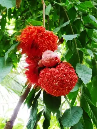 Die beeindruckenden, kugelförmigen und schirmrispigen Blütenstände enthalten dicht gedrängt, zahlreiche Blüten. Die zwittrigen und gestielten Blüten besitzen eine doppelte Blütenhülle. Sie sind bis 8 cm lang mit einem schmalen Blütenbecher. Es sind jeweils verschiedene Tragblätter vorhanden, verkehrt-eiförmige, reitende und fädige, diese sind abfallend, sowie zwei rötliche Deckblätter, die röhrig zweilappig verwachsen sind. Es sind 4(5, zwei sind verwachsen) rote Kelchblätter vorhanden. Die 5 spatelförmigen Kronblätter sind scharlachrot. Die bis 11 langen Staubblätter sind gelb und im unteren Teil röhrig verwachsen. Der mittelständige Fruchtknoten ist gestielt, gynophor mit einem langen schlanken Griffel.