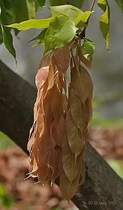 Junge Blätter und kurzen Zweige, die sich rasch entwickeln, hängen am Anfang schlaff herab und sind hell bis rosafarben-braun. Dieses sogenannte „Laubausschüttung“ ist ein Phänomen bei tropischen Pflanzenarten, denn die Bildung von Stützgewebe und Chlorophyll findet nach und nach statt. Kälteeinwirkung, die diesen Vorgang beschädigen kann, kommt dort nicht vor.