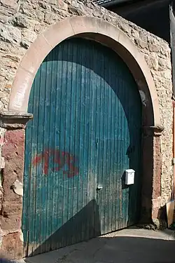Die Bruchsteineinfriedigungsmauer mit rundbogiger Tordurchfahrt steht zwischen den Häusern 133 und 135, die früher ein Anwesen waren. In dem Anwesen war früher die Vikarie untergebracht.