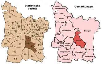 ![]() Die Statistischen Bezirke 42 (Schönfeld), 44 (Bachfeld) und 45 (Bierlach) sowie die Gemarkung Bruck in Erlangen