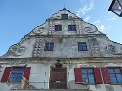 Der zweigeschossige Satteldachbau mit geschweiftem Volutengiebel, gekehlten Trauf- und Giebelgesimsen hat eine Lisenengliederung im dreigeschossigen Giebelfeld sowie eine Krangaube. Das Obergeschoss hat vier zu sechs Fensterachsen.