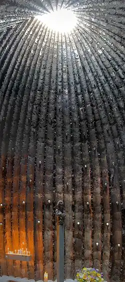 Entstanden ist ein von außen minimalistisch blockhafter, fensterloser Turmbau über fünfeckigem Grundriss. Der Innenraum wirkt wie eine Höhle in der zeltartigen Form der Innenschalung, die Wände zeigen deutlich die Struktur der Fichtenstämme. Der Raum ist nach oben offen, er lässt in den Himmel blicken, aber auch Licht und Regen in den ansonsten dunklen Raum fallen. Elektrische und sanitäre Installationen sind nicht vorhanden. Es ist schon wegen der räumlichen Enge ein Ort für die persönliche Meditation und nicht für gemeindliche Gottesdienste. Die Kapelle besitzt keinen Altar. Nur ein Opferkerzenständer aus Stahl und eine Bank aus Lindenholz stehen bereit.[9]