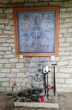 Wände, Bänke und Boden bestehen aus Jurakalk. Die Bänke sind mit Holzplatten versehen. Der Dachstuhl ist aus Holz erstellt. Auch für die Dacheindeckung wurden Jurakalkplatten verwendet. Zwei schmale und hohe Fensterbänder im Norden geben dem Sakralraum sein natürliches Licht.[4]