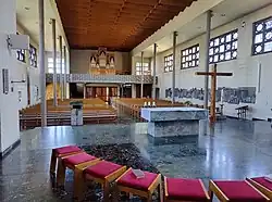 Das geostete Kirchengebäude besteht aus dem rechteckigen Kirchenschiff, dem östlich daran anschließenden eingezogenen Chor, an den eine Sakristei angebaut ist und dem auf der Nordseite nahe der Eingangsfassade angebauten Kirchturm. Alle Bauteile sind mit einem flach geneigten Satteldach gedeckt, der Chor etwas höher als das Kirchenschiff. Im Innern finden wir ein schlichtes Langhaus, das von rechteckigen Fenstern aus Betonelementen und klarem Glas natürlich belichtet wird. Die Decke ist in Holz ausgeführt und hat eine Rippenstruktur. Den Blick auf sich zieht die Chorrückwand aus Naturstein, die in Steinschnitt eine große Darstellung des segnenden Christus zeigt.