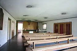 Die Werktagskapelle wurde an den Kirchenraum als Verlängerung gegen Norden angebaut und besitzt wie das Kirchenschiff einen trapezförmigen Grundriss, jedoch ohne abgerundete Ecken. Es handelt sich um einen schlichten, niedrig gehaltenen Raum, der sich wie das Kirchenschiff auch gegen den Altar hin leicht verjüngt. Mittels Schiebewand kann die Kapelle zur Kirche hin geöffnet werden. Von Paul Stöckli stammt das Glasfenster, das das Wirken des Hl. Bruder Klaus aufgreift.