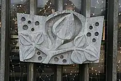 An der Hauptfassade der Kirche, zwischen den beiden Eingangsportalen, wurde mittig eine Steinmetzarbeit von Albert Schilling angebracht, die ein marianisches Relief trägt, dies in Anlehnung an die Frömmigkeit des Kirchenpatrons, des Hl. Bruder Klaus. Das Relief thematisiert die Lauretanische Litanei zu Ehren Muttergottes, die dort als Rosa mystica (als mystische Rose) angerufen wird. Umgeben ist die Rosa mystica von den 15 Perlen der drei Rosenkranzgeheimnisse.[9]