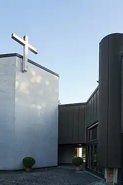 Auf einem erhöhten Geländevorsprung mit freier Sicht zum Thunersee steht das vieleckige Kirchengebäude, abgetrennt durch einen offenen Hof und dem zweistöckigen Profanbau für die Gemeinderäume zur daneben talwärts führenden Belvédèrestrasse. Direkt an der Geländeecke ist der niedrige Glockenturm, mit breiten Lamellen als Schallöffnung, angebaut. Bergseitig schliesst eine eben Fläche mit Parkplätzen und dem Kirchenvorplatz an. Der Zugang zum Kircheneingang und zu den übrigen Räumen führt durch einen teils überdachten Durchgang zum Innenhof. Ein Betonkreuz am Dachrand darüber zeichnet den Bau als Kirche aus.