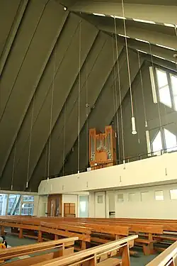 Die Kirche besitzt auf der südlichen Frontseite zwei Zugänge zur Kirche. Unter der Orgelempore hindurch gelangt der Besucher in den Kirchenraum, der durch die zeltförmige Dachkonstruktion geprägt wird. Die Bänke für die Gottesdienstgemeinde sind um den Altarraum gruppiert, der um eine Stufe etwas vom Raum für die Gemeinde erhöht ist.