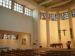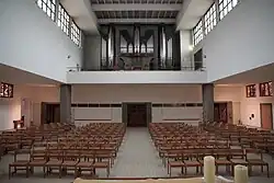 Im Innern spannen sich die Hochmauern des Mittelschiffs als horizontale Träger direkt von der Orgelempore bis zum Altarraum.[15] Möglich gemacht wird das durch die Verwendung von Eisenbeton. Indem diese Konstruktion einen (bis auf die beiden Stützen der Orgelempore) säulenfreien Innenraum schafft, ist von den ursprünglich 520 Sitzplätzen ein freier Blick auf den Altarraum vorhanden. Bei der heutigen Bestuhlung bietet die Kirche noch 350 Sitzplätze. Die hohe Wand über den Seitenschiffen, die durchgehenden Fensterbänder und der kräftig ausgebildete Deckenunterzug prägen den Kirchenraum.[16]