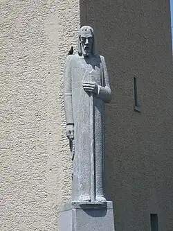 Die Kirche Bruder Klaus wurde neben die wesentlich grössere reformierte Pauluskirche, die ebenfalls im Jahr 1933 fertiggestellt wurde, an die Milchbuckstrasse gesetzt. Im Gegensatz zur Pauluskirche, zu der „eine breite Freitreppe auf den weiten Platz, der zur imposanten Turmfassade hinführt“,[12] waren beim Bau der Bruder Klaus-Kirche weder der Platz noch das Geld für eine analoge Platzgestaltung vorhanden. Um auf den Standort der Kirche aufmerksam zu machen, wurde der Kirchturm an die Ecke zur vielbefahrenen Milchbuckstrasse gesetzt. Am Fuss des Kirchturms wurde eine überlebensgrosse Statue des Bruder Klaus aus Granit angebracht. Sie stammt vom Bildhauer Alphons Friedrich Magg (1891–1967).[13] Das an sich schlichte Gotteshaus trägt als charakteristisches Merkmal an der Frontseite der Kirche und auch auf der Höhe des Glockenstuhls am Turm runde Fenster mit markanter Gitterstruktur. Genau das gleiche Element findet sich auch an der Südseite der ebenfalls von Anton Higi erbauten Kirche St. Martin (Zürich-Fluntern).