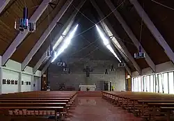 Über den gesamten Südgiebel erstreckt sich ein Buntglasfenster, das für eine Beleuchtung in tiefen Blautönen des Kirchenraums sorgt. An der einen Längsseite des Kirchenschiffs befinden sich etwa 3 Meter hohe Fenster zum Innenhof des Pfarrzentrums. Als 2013 ein Fenster zerstört wurde, ließ der ehemalige Kirchenbauverein[1] es durch Glaspanelen ersetzen, die von dem Künstler Reiner John gestaltet sind.[2]
