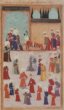- ↑ Übersetzung Konrad Dilger: Untersuchungen zur Geschichte des osmanischen Hofzeremoniells im 15. und 16. Jahrhundert (= Beiträge zur Kenntnis Südosteuropas und des Nahen Orients. Bd. 4). Trofenik, München 1967 (zugleich Dissertation, Ludwig-Maximilians-Universität München 1967), S. 30.