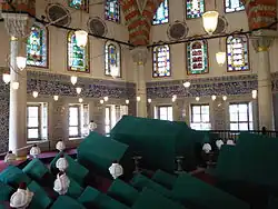 Murad III. starb im Januar 1595. Von seinen über 100 Abkömmlingen überlebten ihn 20 Söhne (und 27 Töchter).[96] Der älteste Sohn Mehmed war Ende 1583 zum Statthalter von Saruhan bestellt worden. Am 27. Januar 1595 – einem Freitag – traf Mehmed in Istanbul ein und bestieg den Thron. In der Freitagspredigt wurde nun der Name des neuen Souveräns genannt. Am Folgetag ließ Mehmed III. seine 19 Brüder erdrosseln.[97] Die Totengebete wurden unter Teilnahme der Großen des Reiches vom Scheichülislam Bostanzâde Mehmed Efendi geleitet. Die Prinzen wurden gemeinsam mit dem Vater beigesetzt. In dem vom Hofbaumeister Dâvud Agha (gest. um 1598) begonnenen und 1599 von Dalgıç Ahmed Agha (gest. 1607) fertiggestellten Mausoleum Murads III. (Karte) sollen insgesamt 54 Personen begraben liegen, wobei im Bauwerk heute insgesamt 50 Ṣandūḳa (leere Holzsarkophage) vorhanden sind.[98]