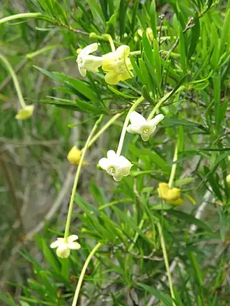 Brunfelsia densifolia ist ein 6 bis 10 m hoher Baum, dessen Stamm einen Durchmesser von 13 cm erreichen kann. Die Pflanzen sind komplett unbehaart. Die Zweige sind rutenförmig, schlank und dicht mit Laubblättern besetzt. Diese sind lederig, linealisch-langgestreckt bis linealisch-umgekehrt lanzettlich oder linealisch geformt. Sie werden 5 bis 10 cm lang und 5 bis 10 mm breit, nach vorn hin sind sie zugespitzt oder stumpf, die Basis ist lang spitz zulaufend. Die Oberseite der Blätter ist glänzend, die zahlreichen Blattadern stehen nahezu parallel. Die Blattstiele sind 4 bis 9 mm lang.