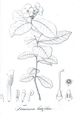 - ↑ Brunfelsia latifolia bei Tropicos.org. In: IPCN Chromosome Reports. Missouri Botanical Garden, St. Louis