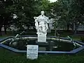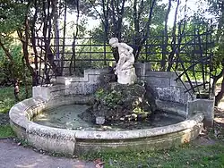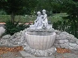 Steinbrunnen mit Bronzeplastik | Viktor Tilgner | 1880 | Auf einem mit Buschwerk zugewachsenen Steinsockel steht die Wasser speiende Figur des griechischen Meeresgottes Triton, der eine Nymphe trägt. Dahinter eine Putte mit einem Fisch als weiterem Wasserauslass. |