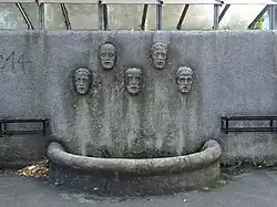 Brunnenbassin an einer Mauer | 1936 | Auf dem Bassin befindet sich das Fresko „Markgraf Leopold und seine Gemahlin Agnes bei der Übergabe der Kirche“. | ||