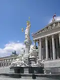 Brunnen mit Figuren aus Laaser Marmor | Entwurf: Theophil von Hansen. Bildhauer: Carl Kundmann, Josef Tautenhayn, Hugo Haerdtl | 1902 | Figurengruppe bestehend aus vier Flussallegorien, zwei die gesetzgebende und vollziehende Gewalt darstellende Frauenfiguren und auf einer Säule Pallas Athene. Der Brunnen wurde 2005 generalsaniert.[12] |