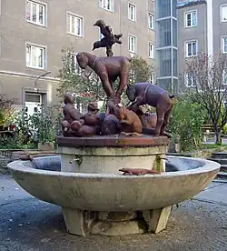 Steinbrunnen mit mosaizierter Schale, der von sechs Affenfiguren und einer Schildkrötenfigur flankiert wird. | Hubert Wilfan | 1953 | Auf dem Gelände des Julius-Deutsch-Hofes | |