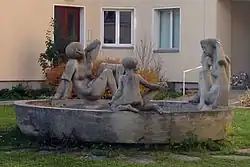 Zwei steinerne menschliche Figuren in einem Brunnenbassin | Hannes Haslecker | 1957 | Am Bauwich der 1955–1957 errichteten Wohnhausanlage |
