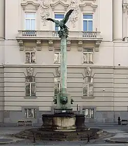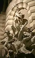 Brunnen mit Figuren aus Laaser Marmor und Schale aus rotem Granit | Edmund Hellmer | 1897 | Am Michaelerplatz an der Außenseite des Michaelertraktes der Hofburg. Figurengruppe mit Giganten, einem Adler und einer Schlange, darüber eine männliche Figur mit Schwert. |
