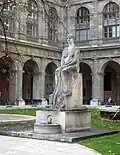 Brunnen mit Steinfigur und eiserner Schlangenskulptur | Edmund Hellmer | 1910 | Im Innenhof der Universität. Die Figur der Nymphe Kastalia sitzt auf einem Thron, um den sich ihr Vater Acheloos in Gestalt einer Schlange windet. Auf der Rückseite des Sitzes befindet sich das Relief eines eine Schlange bezwingenden Mannes.[11] |
