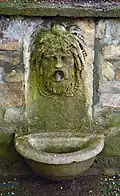 Wandbrunnen mit Steinschale und Maske als Schlussstein | Architektur: Friedrich Ohmann | 1906 | An der Terrasse, die das Palmenhaus vom Burggarten abhebt | |