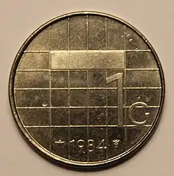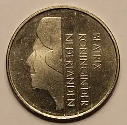 - Letzte Kursmünzen des niederländischen Guldens zu 5 Cent, 10 Cent, 25 Cent, 1 Gulden, 2½ Gulden und 5 Gulden mit dem Kopfbild von Königin Beatrix (1980, geprägt von 1982 bis 2000);[7]