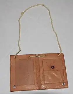 Der Brustbeutel ist eine kleine, flache Tasche, die mit einem Baumwollband oder einer Schnur um den Hals getragen wird. Er befindet sich unter oder über der Kleidung und auf Brust- oder Bauchhöhe.