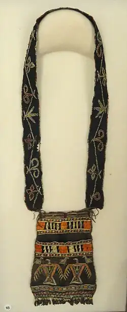 Um den Hals getragene Beutel lassen sich bereits bei den nordamerikanischen Indianern nachweisen. Eine verbreitete Form war der sogenannte Medizinbeutel, in dem der „Medizinmann“ (Schamane) verschiedene Gegenstände wie Steine, Kräuter und weitere Dinge, denen übernatürliche Kräfte zugeschrieben wurden, aufbewahrte.[1] Andere dienten zur Aufbewahrung von Schmuck, Körperpflegemitteln, Farbe oder Nähzeug.[2]