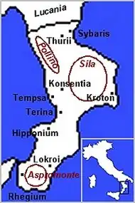 Bruttium ist die alte Bezeichnung für die historische Landschaft im äußersten Süden des italienischen Stiefels, die sich in etwa mit dem heutigen Kalabrien deckt. Im Norden begrenzt von Lukanien wird die Halbinsel umspült vom Tyrrhenischen Meer im Westen und vom Ionischen Meer im Süden und Osten. Der Apennin bedeckt das Landesinnere mit den Gebirgszügen des Pollino, der Sila und des Aspromonte. Städte waren Consentia (Hauptstadt, das heutige Cosenza), Kroton, Sybaris, Hipponium, Rhegium, Lokroi Epizephyrioi, Scylaceum und Medma. Die Bewohner des Landstriches, die Bruttier (Bruttii), waren ein Volk in Unteritalien, das zu den Oskern gehörte.[1] Sie sollen abtrünnige Lukaner gewesen sein und erhielten deshalb ihren Namen, der in der Landessprache „Rebellen“ bedeutet haben soll.