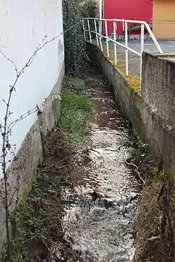 - (Abfluss der/einer Wiesenquelle), von links auf etwa 147 m ü. NHN am Ortsrand von Rübenach, ca. 0,2 km