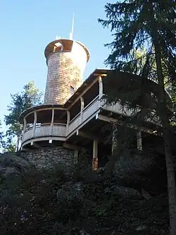Das „neue“ Hoh-Haus am Buchberg war als Tourismuswahrzeichen geplant. Die Idee, eine Aussichtswarte an der Stelle der ehemaligen Fliehburg des Mittelalters zu errichten, entstand bereits im Jahr 2005. Das Hoh-Haus wurde am 25. September 2011 eröffnet.[10][11] Ein wesentlicher Teil der Arbeit wurde durch freiwillige Arbeitsstunden geleistet.[12] Die Projektkosten betrugen rund 230.000 Euro, wobei die Hälfte des Betrags durch Fördermittel aufgebracht wurde.[13]
