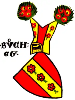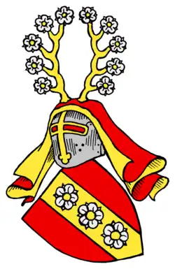 - In Gold pfahlweise drei rote Rosen. Als Helmzier ein wachsender Männerrumpf in Gold mit drei roten Rosen pfahlweise, roter Mütze und goldenem Stulp. Die Helmdecken sind aussen Rot, innen Gold.[7]