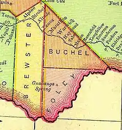 Per Gesetz vom 15. März 1887 wurden aus dem Presidio County drei neue Countys abgetrennt: Buchel County, Foley County und Jeff Davis County. Kurz zuvor war bereits das Brewster County aus Gebieten des Presidio Countys neu gegründet worden. Das damalige Brewster County umfasste den westlichen Teil des heutigen Brewster Countys, Buchel County den nordöstlichen Teil mit der Stadt Marathon, die Sitz der County-Verwaltung werden sollte. Benannt wurde das Buchel County nach dem aus Deutschland stammenden Augustus Carl Büchel, einem texanischen Kriegshelden.[1] Es gelang in den Folgejahren nicht, das dünn besiedelte Buchel County als County zu organisieren, und am 22. März 1889 wurde dem Brewster County die Aufgabe übertragen, temporär die Verwaltungsaufgaben im Buchel County zu übernehmen. Gemäß der Volkszählung 1890 hatte das Buchel County 298 Einwohner, die meisten davon lebten in Marathon, bis auf elf Einwohner waren es Weiße.