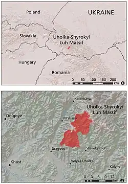 Das Schutzgebiet Uholka-Schyrokyj Luh liegt in Transkarpatien (auch Karpatenukraine) und gehört zum Karpaten-Biosphärenreservat. Es enthält den weltweit größten zusammenhängenden Urwald aus Rotbuche (Fagus sylvatica), rund 9000 ha[1][2]. Teile dieser Buchenurwälder wurden bereits 1920 unter Schutz gestellt. Seit 1992 zählt das Reservat zum UNESCO-Weltnaturerbe, das 2007/2011 um weitere europäische Buchenurwäldern und alte Buchenwälder erweitert wurde[3]. Uholka-Schyrokyj Luh ist Gegenstand der Naturforschung[4] und der Urwald wurde 2010 erstmals in einem ukrainisch-schweizerischen Projekt inventarisiert[5][6]. Für 2019 ist eine Veränderungsinventur geplant. Zudem wurde 2001 in Mala Uholka eine Forschungsfläche von 200 auf 500 m (10 Hektar) angelegt. Das Schutzgebiet Uholka-Schyrokyj Luh liegt in Transkarpatien (auch Karpatenukraine) und gehört zum Karpaten-Biosphärenreservat. Es enthält den weltweit größten zusammenhängenden Urwald aus Rotbuche (Fagus sylvatica), rund 9000 ha[1][7]. Teile dieser Buchenurwälder wurden bereits 1920 unter Schutz gestellt. Seit 1992 zählt das Reservat zum UNESCO-Weltnaturerbe, das 2007/2011 um weitere europäische Buchenurwäldern und alte Buchenwälder erweitert wurde[8]. Uholka-Schyrokyj Luh ist Gegenstand der Naturforschung[4] und der Urwald wurde 2010 erstmals in einem ukrainisch-schweizerischen Projekt inventarisiert[5][6]. Für 2019 ist eine Veränderungsinventur geplant. Zudem wurde 2001 in Mala Uholka eine Forschungsfläche von 200 auf 500 m (10 Hektar) angelegt.