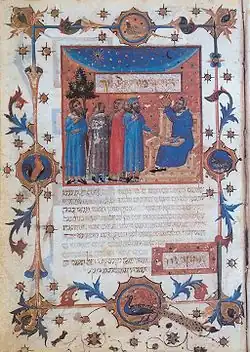 Grundlage der religiösen Literatur war die im Bereich der Römischen Kirche meist lateinisch geschriebene Bibel, deren genaue Zusammensetzung keineswegs unumstritten feststand. So wurde etwa die Apokalypse bis ins 9. Jahrhundert als Teil der Heiligen Schrift abgelehnt, nach der Kanonisierung war der Text jedoch ein bevorzugter Gegenstand der Buchillustration. Andere häufig illustrierte Bücher waren die Genesis, das Evangeliar und der Psalter, die oft mit theologischen Kommentaren verbunden wurden. Diejenigen Bücher, die zeitweise der Bibel zugerechnet, letztlich aber nicht kanonisiert wurden, werden als Apokryphen bezeichnet und haben häufig starken Einfluss auf die Ikonographie biblischer Themen ausgeübt. Die Ausstattung der verschiedenen biblischen Bücher mit Illustrationen ist sehr ungleichmäßig, was mit der Tatsache zusammenhängt, dass die spätantiken und frühmittelalterlichen Bildzyklen die Funktion hatten, die typologische Exegese, also die Auffindung des mehrfachen Schriftsinns im Sinne der spätantiken Symboltheorie, zu unterstützen.[7] Die Bücher der Bibel wurden zunächst meist einzeln aufgeschrieben, nur wenige großformatige und oft prächtig ausgestattete Vollbibeln dienten der Lesung in den Klöstern. Erst seit dem hohen Mittelalter kam vor allem im Umfeld der Pariser Universität die einbändige Vollbibel im Oktavformat für den privaten Gebrauch auf, die im 13. Jahrhundert als handliche „Taschenbibel“ in so großer Zahl hergestellt wurde, dass der Bedarf bis zum Aufkommen des Buchdrucks weitgehend gedeckt war. Besondere interpretierende Typen der Bibelillustration waren die um 1220/1230 am französischen Hof entstandenen Bibles moralisées, die Biblia pauperum, die in der ersten Hälfte des 13. Jahrhunderts in Süddeutschland verbreitet war, oder die Historienbibel des Spätmittelalters.