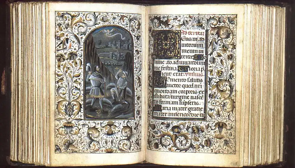 Theologische Traktate und Predigten wurden als Studientexte seltener illustriert, häufiger wurden Legendare bebildert. Bereits in karolingischer Zeit finden sich erste illustrierte Heiligenleben und Biographien kirchlicher Amtsträger.[7] Im Spätmittelalter kam das private Gebet-, Andachts- und Erbauungsbuch für Laien auf, das – besonders in Form des Stundenbuches – zu dem am häufigsten und prächtigsten illuminierten Buchtypus wurde.