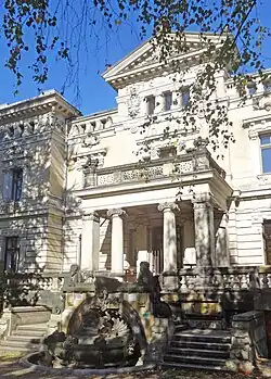 Die Bauarbeiten erfolgten bis 1891, die Familie konnte im folgenden Jahr einziehen. Die reiche Ausstattung umfassen Postelwitzer und Cottaer Sandstein auf den Fassaden sowie Marmor-, Stuck- und Goldverzierung, Kunstverglasungen und feine Holzarbeiten im Innenbereich[3]. Der Mittelrisalit, von ionischen Säulen dekoriert, wird von zwei Flügelbauten flankiert. Ein regelrechtes Bildprogramm an der Hauptfassade präsentiert Fruchtgirlanden, ein Wappen mit den Initialen des Hausherrn im Dreiecksgiebel, einen Löwenkopf oberhalb des Balkons, Frauenköpfe mit Blumenranken auf den Flügeln. Das heutige Flachdach krönte früher eine monumentale Glaskuppel.[4]